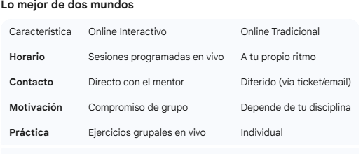 Rompe la pantalla. Olvida el aprendizaje pasivo; únete a nuestras sesiones Online en Vivo donde la interacción no es una opción, es el motor del curso. Aprende en tiempo real junto a expertos y compañeros de todo el mundo. ¿Qué hace que un curso sea «Interactivo»?