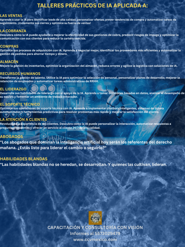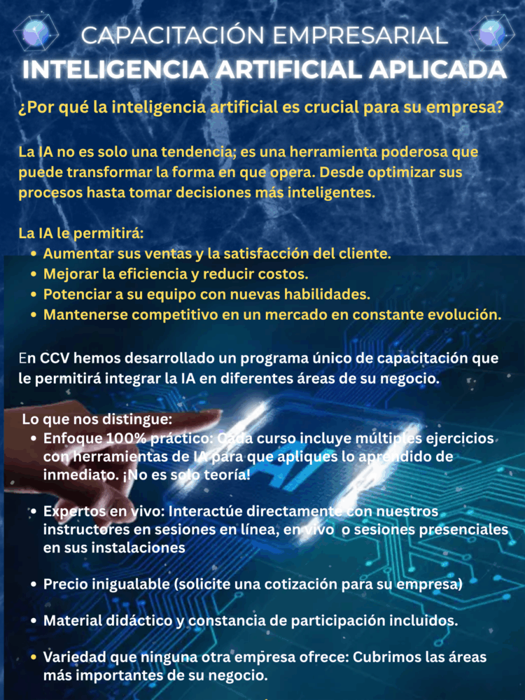 ¿Listo para llevar tus habilidades al siguiente nivel? En CCV, estamos emocionados de anunciar el lanzamiento de nuestros nuevos cursos con Inteligencia Artificial Aplicada.