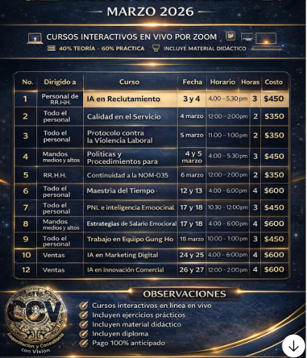 Si algún curso lo necesitan para grupo de personas a partir de 5, es posible reprogramar la fecha y horario de acuerdo a su disponibilidad y la de CCV.